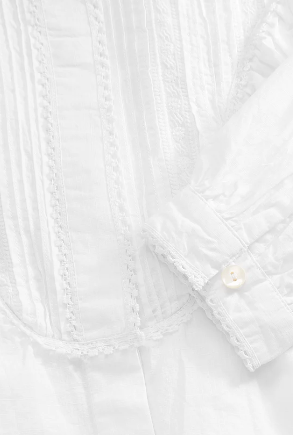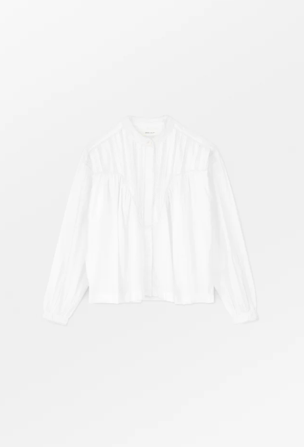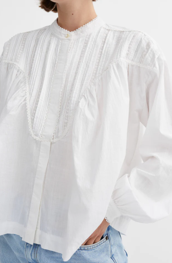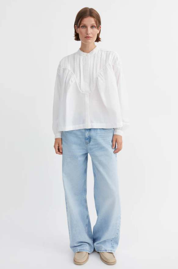 La blusa Aurora es una blusa holgada y ligera, confeccionada en suave algodón orgánico. Presenta la clásica silueta Skall con un corte holgado, mangas voluminosas y delicados detalles de encaje y pliegues que le dan un aire romántico. El cuello alto con lazos y botones de nácar le aporta un diseño clásico y versátil, ideal para cualquier ocasión.