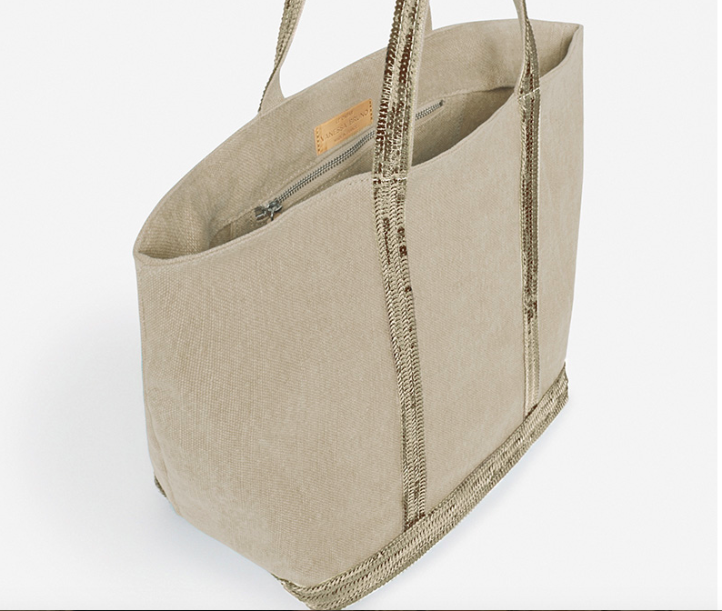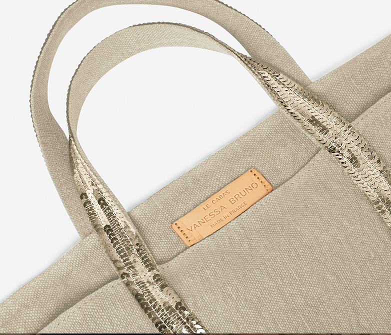 Bolsillo interior con cremallera y etiqueta en piel de curtido vegetal natural con estampado en caliente “Le Cabas Vanessa Bruno made in France”.