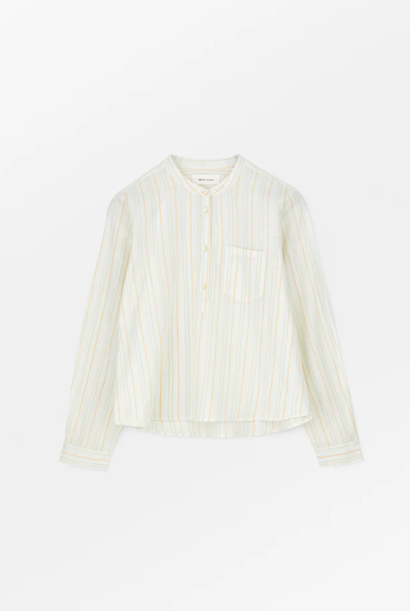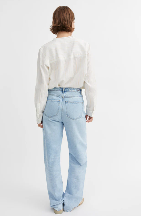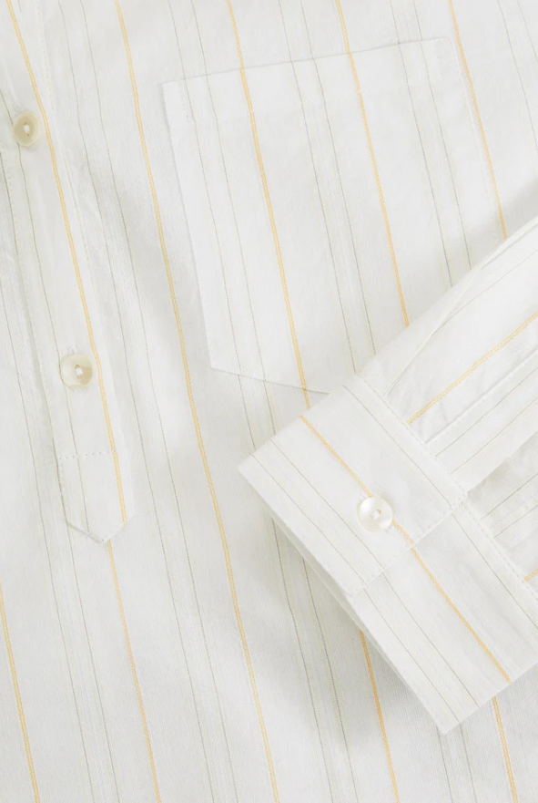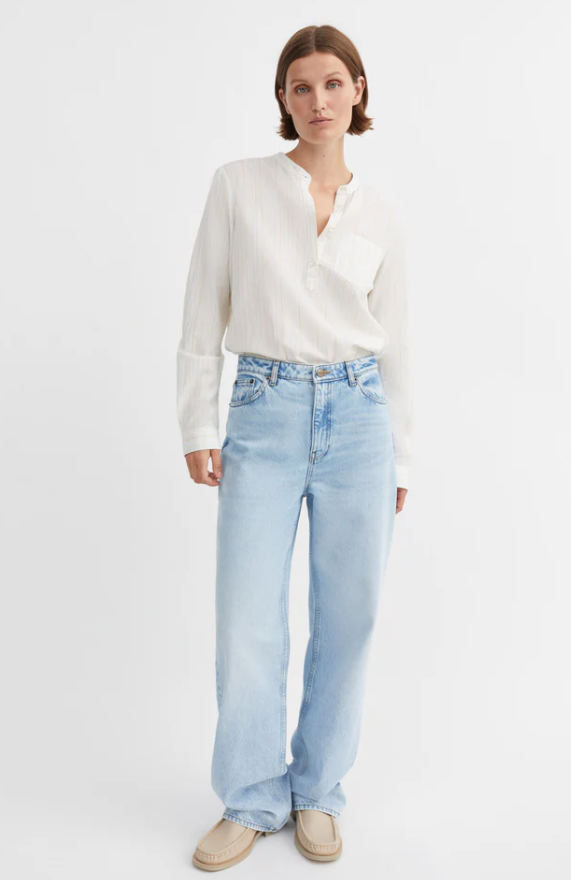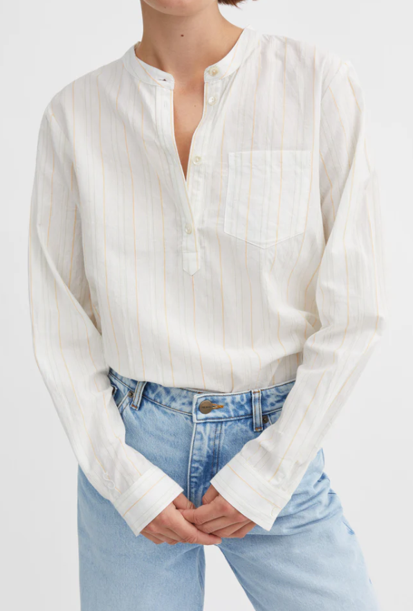 La camisa Agnes es una camisa entallada de popelina de algodón orgánico. Tiene cuello redondo sin cuello, mangas largas con puños y botones hasta la mitad.