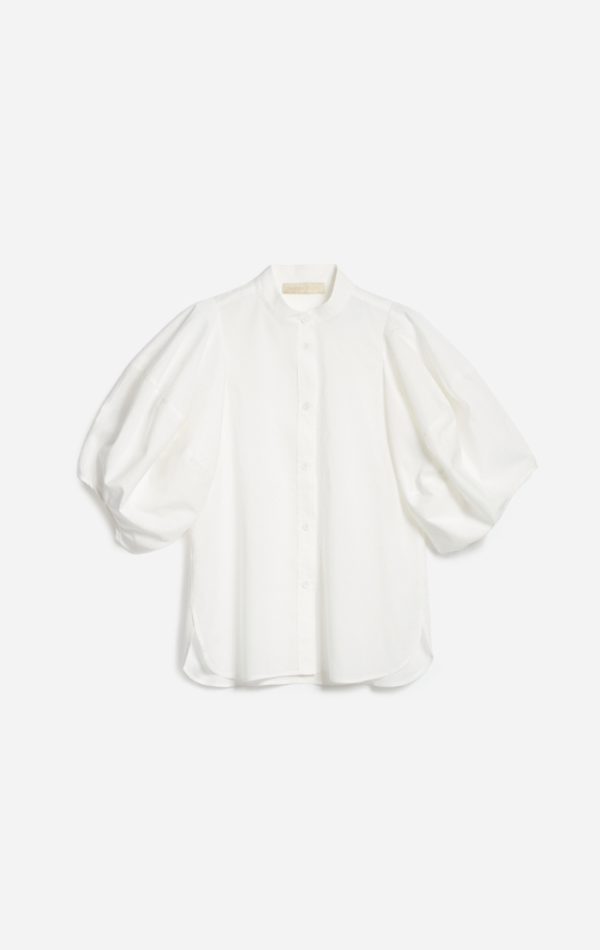 Con volúmenes esculpidos y corte estructurado, esta blusa reinterpreta el estilo femenino con un toque moderno y audaz. Cuello redondo abotonado. Mangas tres cuartos abullonadas. Tejido ligero y cómodo.
