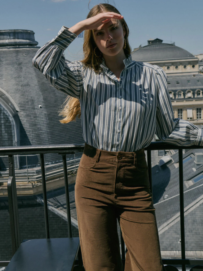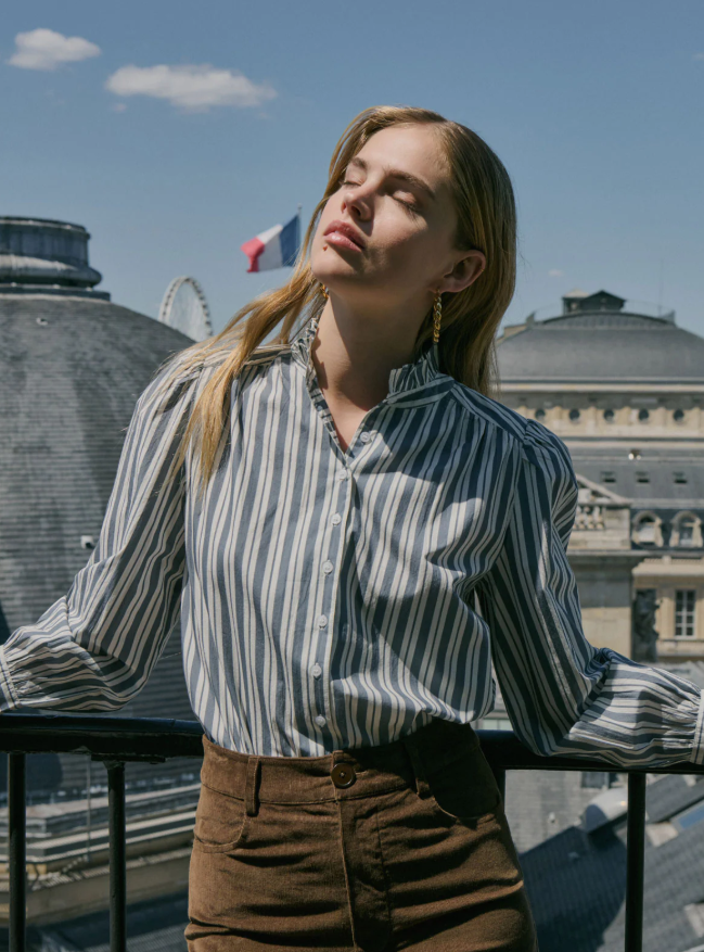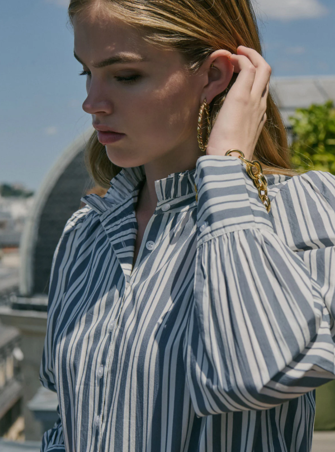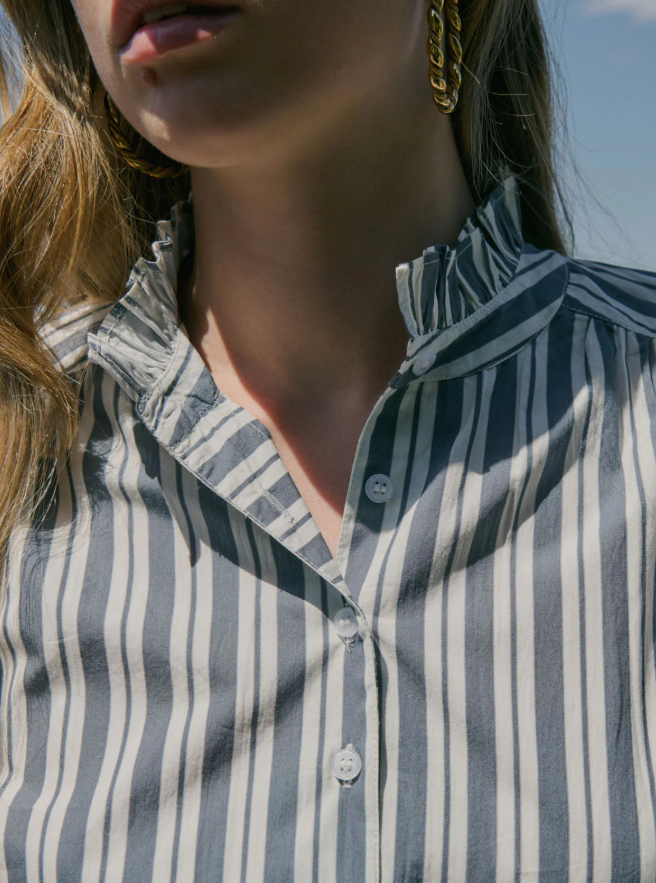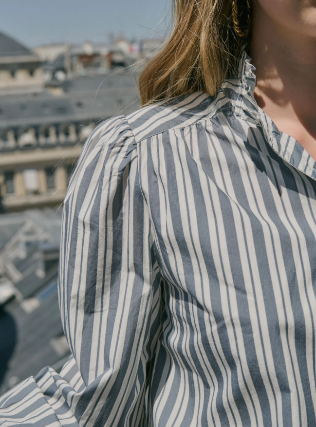 Tabatha – Blusa recta con cuello fruncido y rayas – Azul.