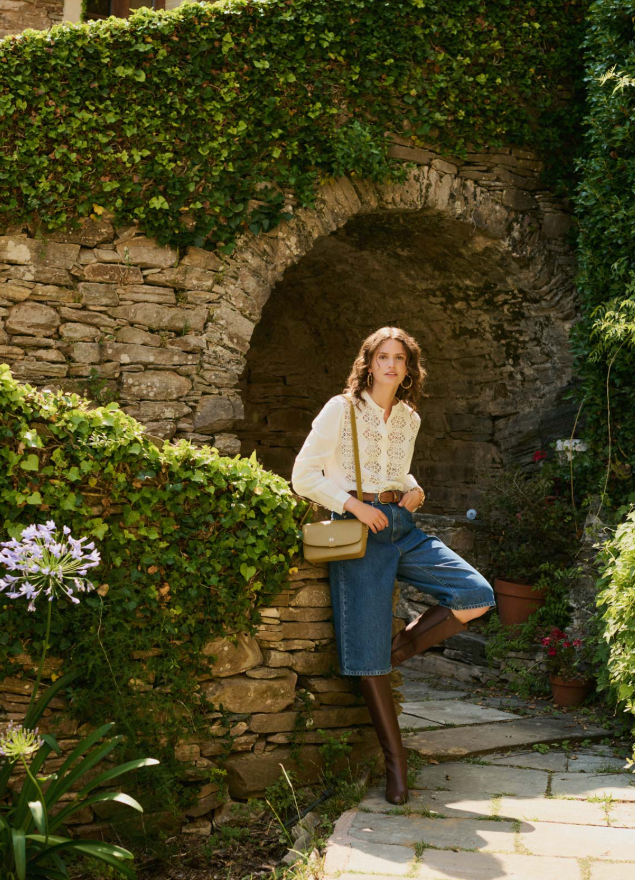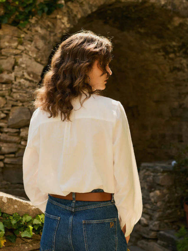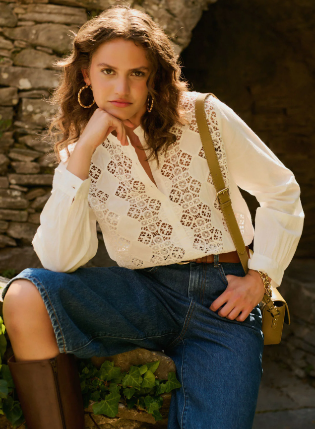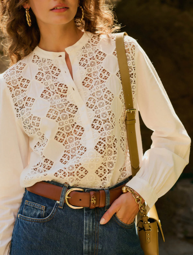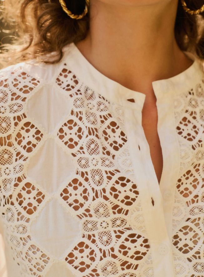 Blusa recta con encaje calado en la parte delantera – Blanco.