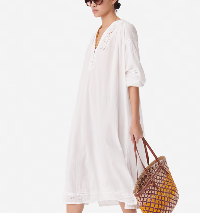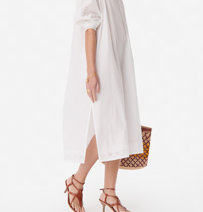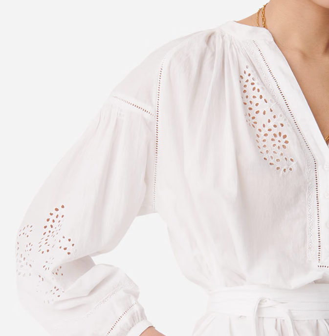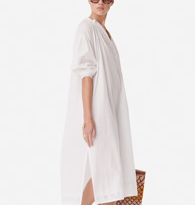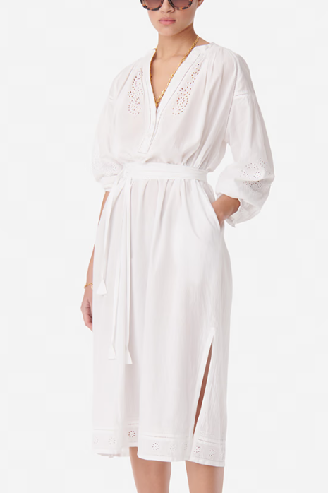 El vestido Catinka retoma el estilo del vestido camisero con escote henley, cierre de botones y mangas abullonadas ligeramente caídas. Elegante y de estilo romántico, presenta un bordado inglés en la parte delantera, las mangas y el bajo del vestido. Su cinturilla ancha y extraíble marca la cintura y añade un efecto ondulante.