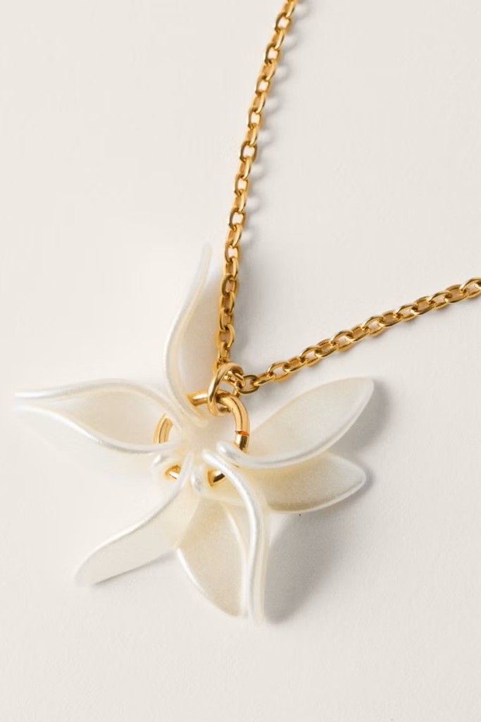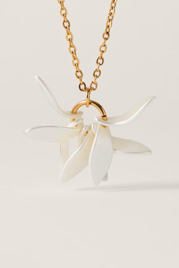 Colgante largo con motivos de pétalos finos hechos en metacrilato, de peso muy ligeros, con cadena de latón, chapada a 3 micras en oro de 18kt.