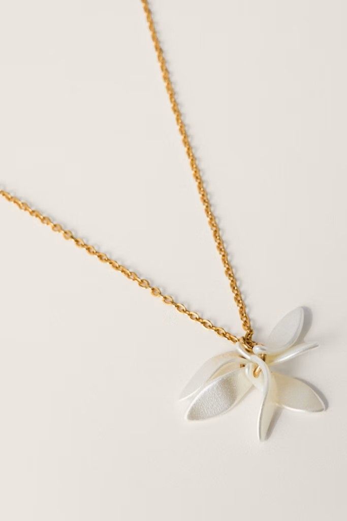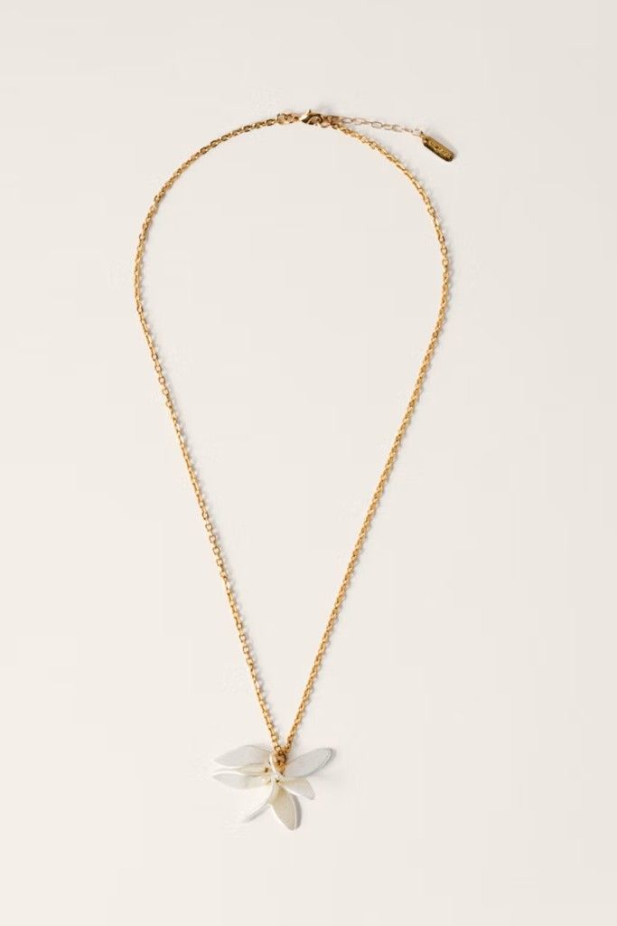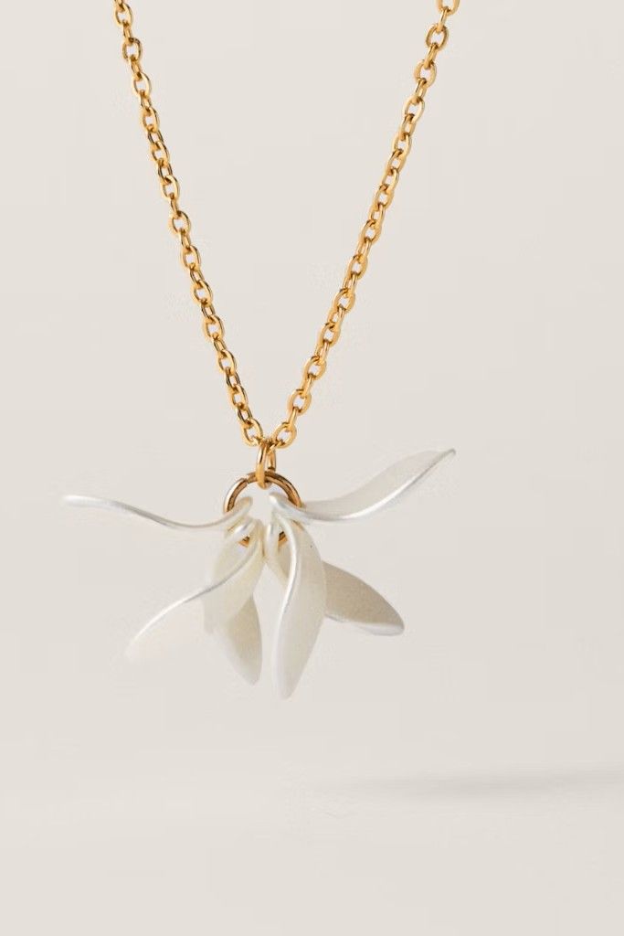 Colgante mediano con motivos de pétalos finos hechos en metacrilato, de peso muy ligeros, con cadena de latón, chapada a 3 micras en oro de 18kt.