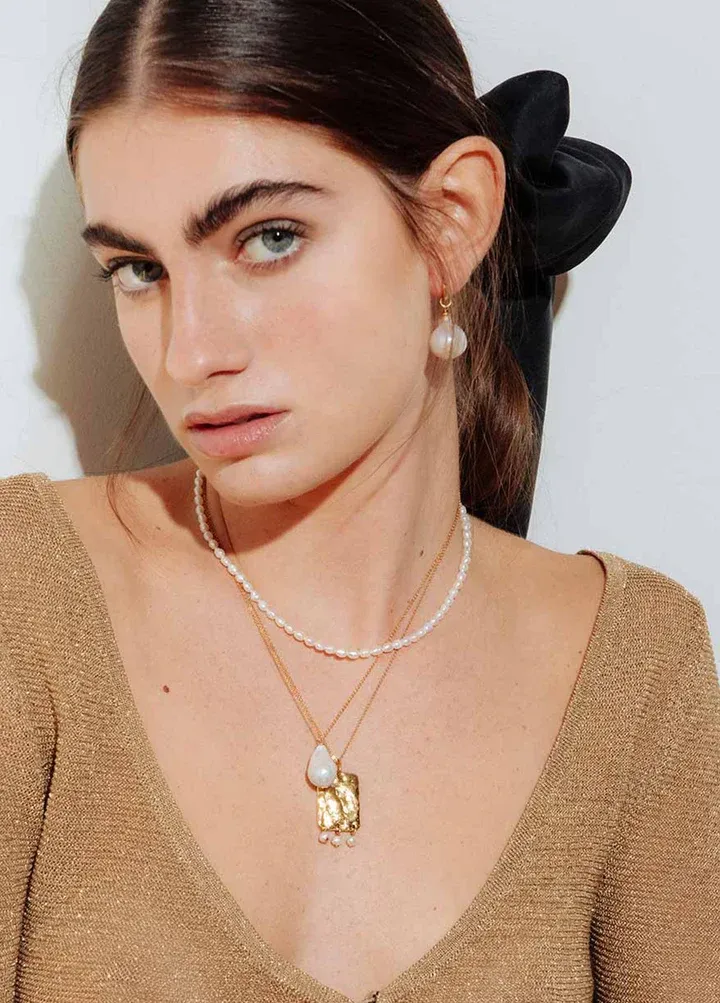 Esta medalla cuadrada de superficie irregular y tres perlitas colgando está inspirada en el clásico collar de Ana Bolena que siempre llevaba y con el que a menudo fue retratada. Según cuenta la leyenda, lo llevaba para ocultar un lunar que tenía en el pecho. Todo está bañado en oro de 24k para que te dure más tiempo como el primer día.