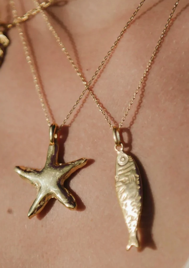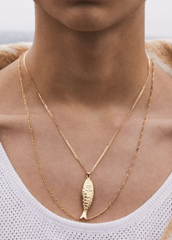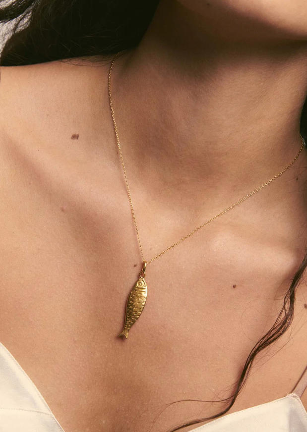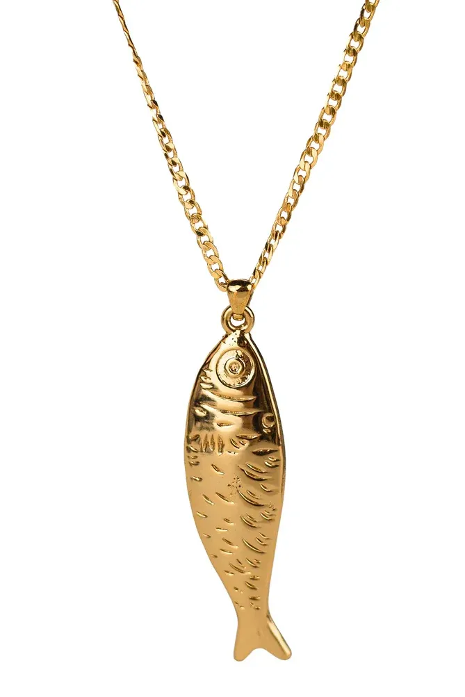 Collar Amuleto Sardina. El pez tiene varios significados, para los simbolistas constituye el principio de todo, el agua y además es identificativo de la cultura mediterránea. Incluye una delicada cadena de 44 cm o de 55 cm. Todo bañado en oro de 18 k.
