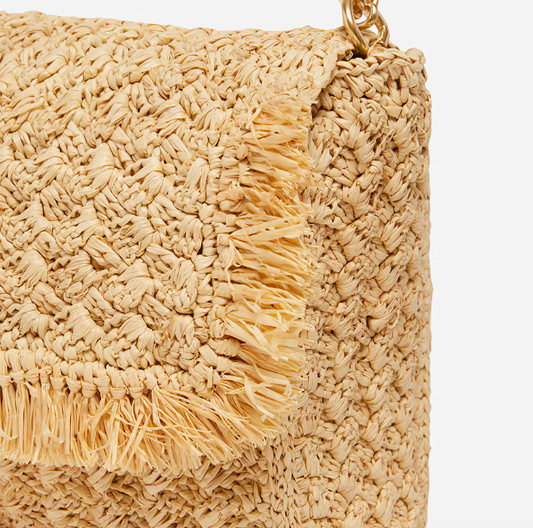 Este complemento de rafia ha sido tejido a mano en nuestro taller de Madagascar. Cada diseño es único y puede tener irregularidades debido al carácter natural de la fibra y la elaboración artesanal del producto.