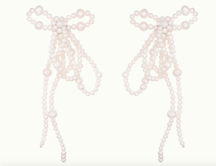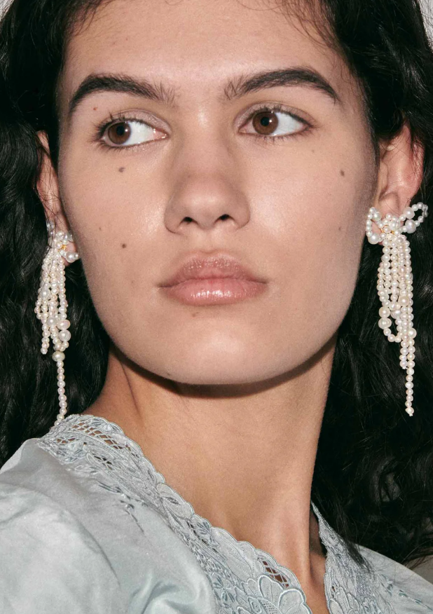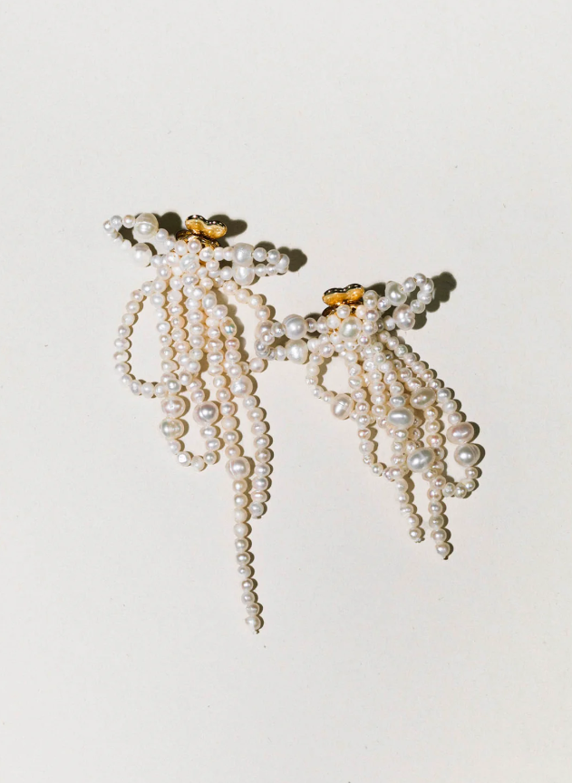 Unos de nuestros diseños más espectaculares. El par de pendientes Musa son unos pendientes de perlas pasadas una una a mano por hilo de nylon formando unos románticos lazos con una larga caída. Son muy delicados y llevan un trabajo manual que lo hacen una joya de culto única.
