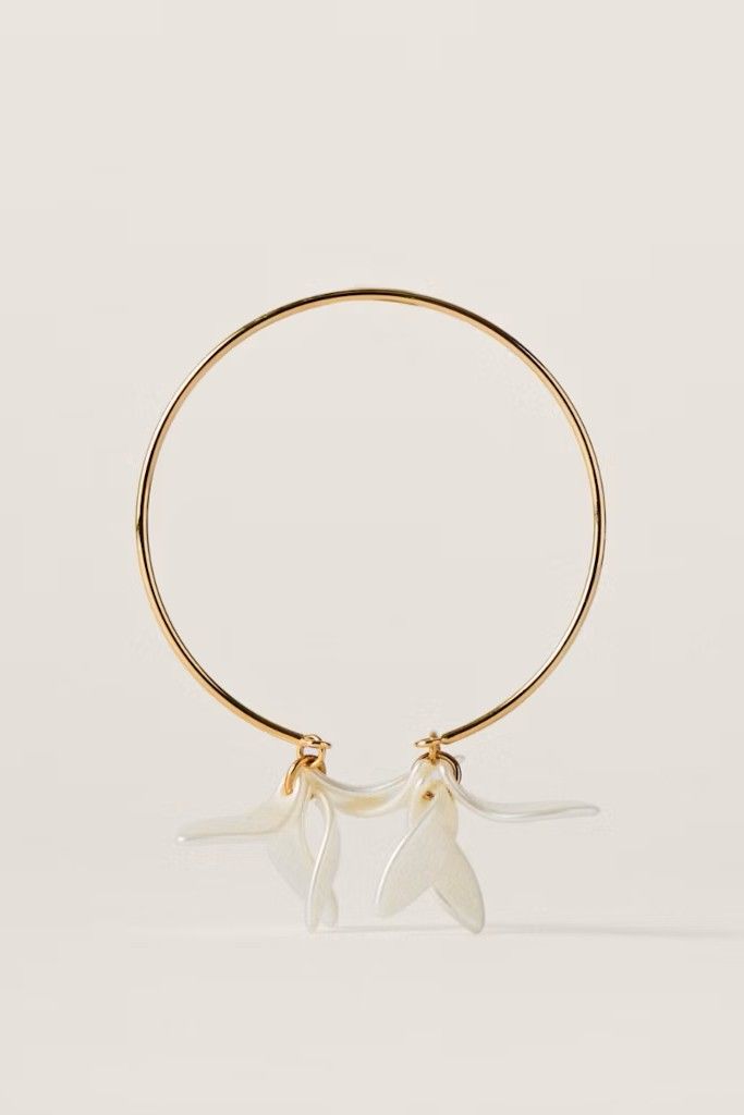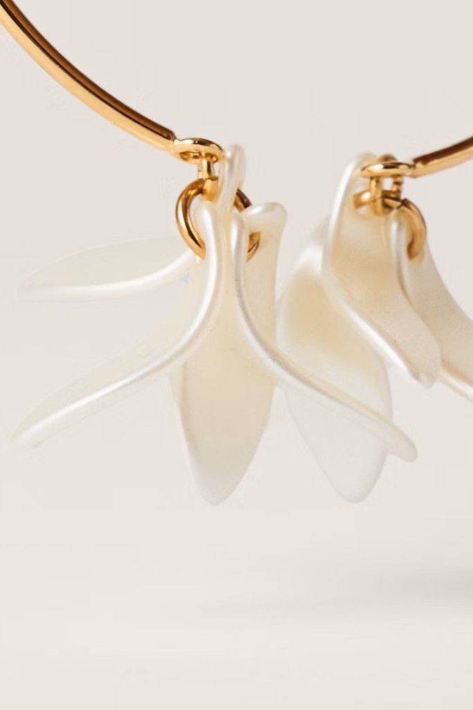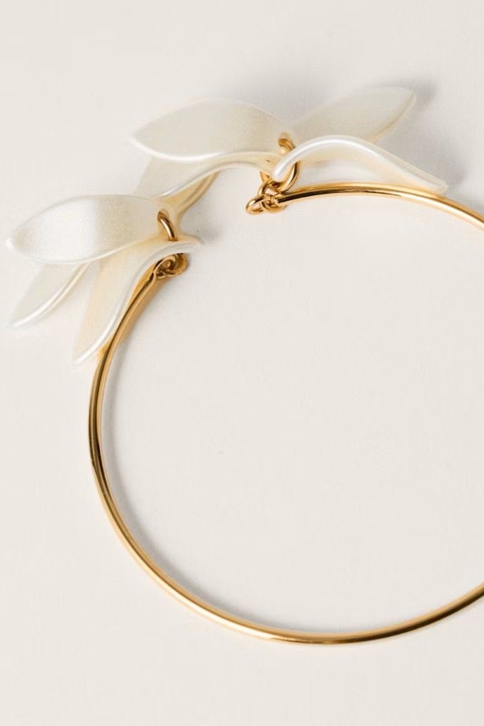 Pulsera con motivos de pétalos finos hechos en metacrilato, de peso muy ligeros, colgados a ambos extremos de la pieza, hecho de latón y chapado en 3 micras en oro de 18kt.