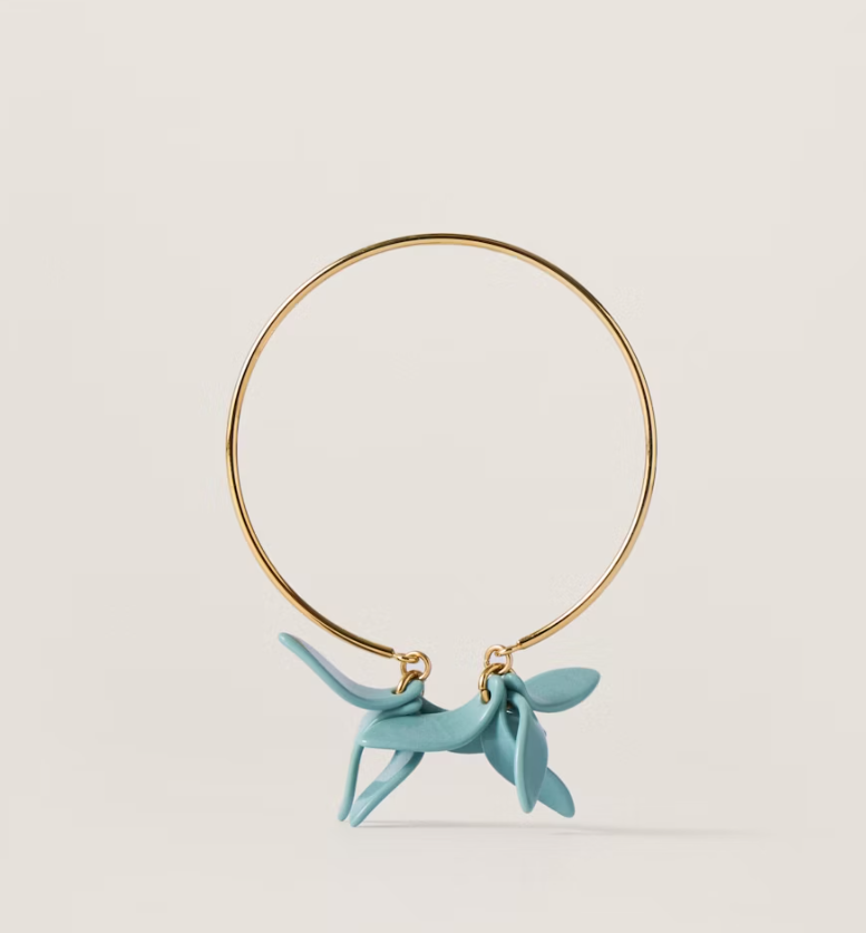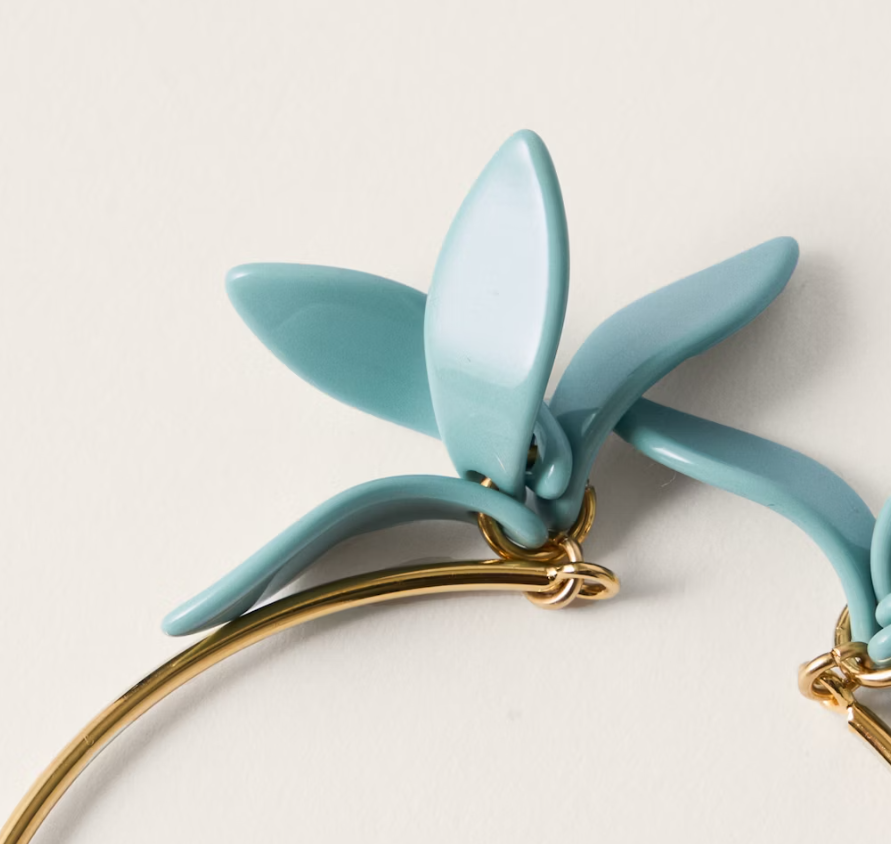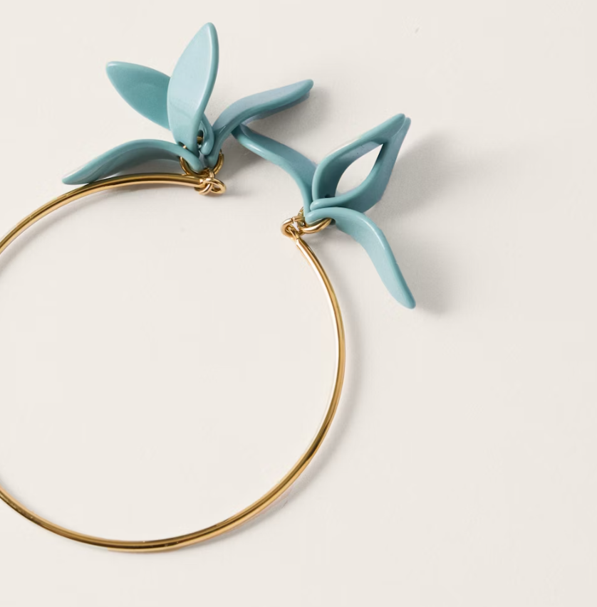 Pulsera con motivos de pétalos finos hechos en metacrilato, de peso muy ligeros, colgados a ambos extremos de la pieza, hecho de latón y chapado en 3 micras en oro de 18kt. La pulsera es regulable para poder ajustar a la medida deseada para cada muñeca o brazo, en el caso de querer usar como brazalete.