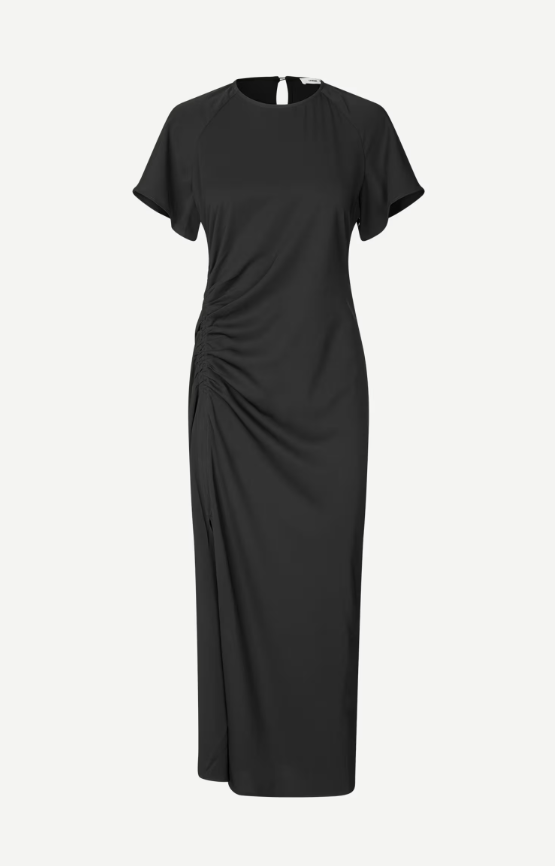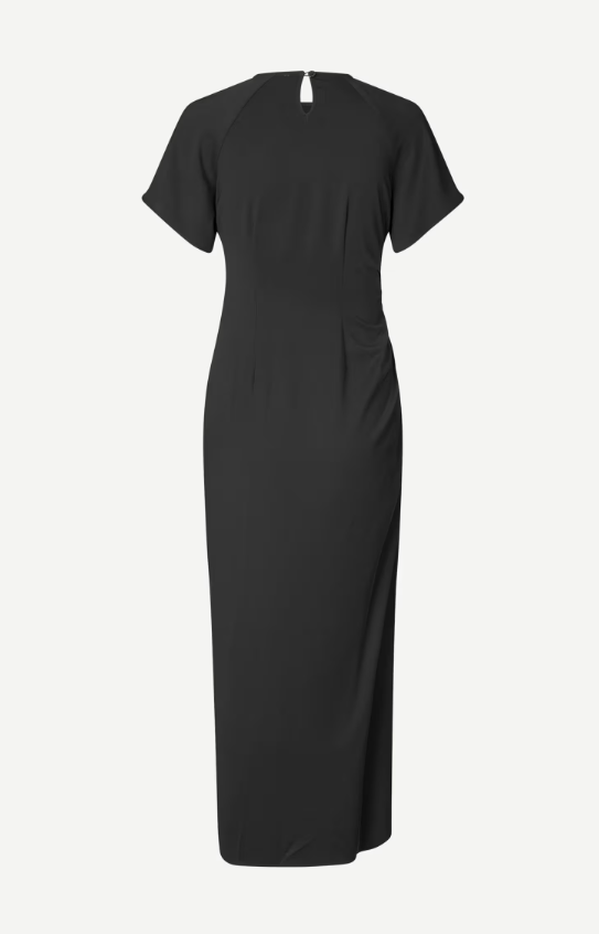 Vestido maxi de manga corta y corte regular. Cierre con botones y trabillas en la espalda y cremallera invisible en el lateral. Fruncido fijo en el lateral. Abertura en la pierna. Material principal: 100 % poliéster reciclado. Este producto cuenta con la certificación GRS. Cada etapa de la cadena de suministro cumple con estrictos requisitos sociales, ambientales y químicos.
