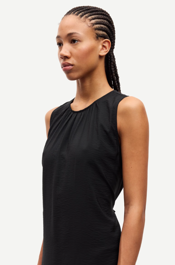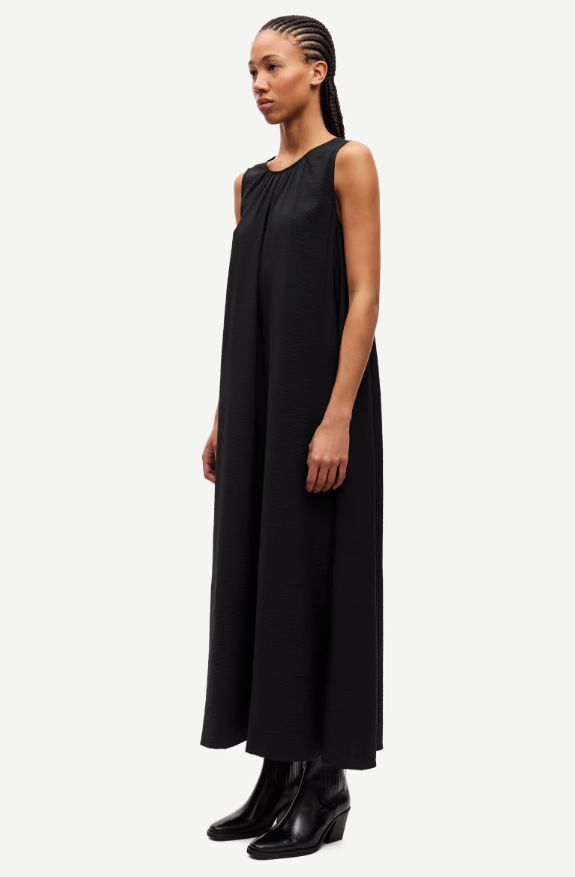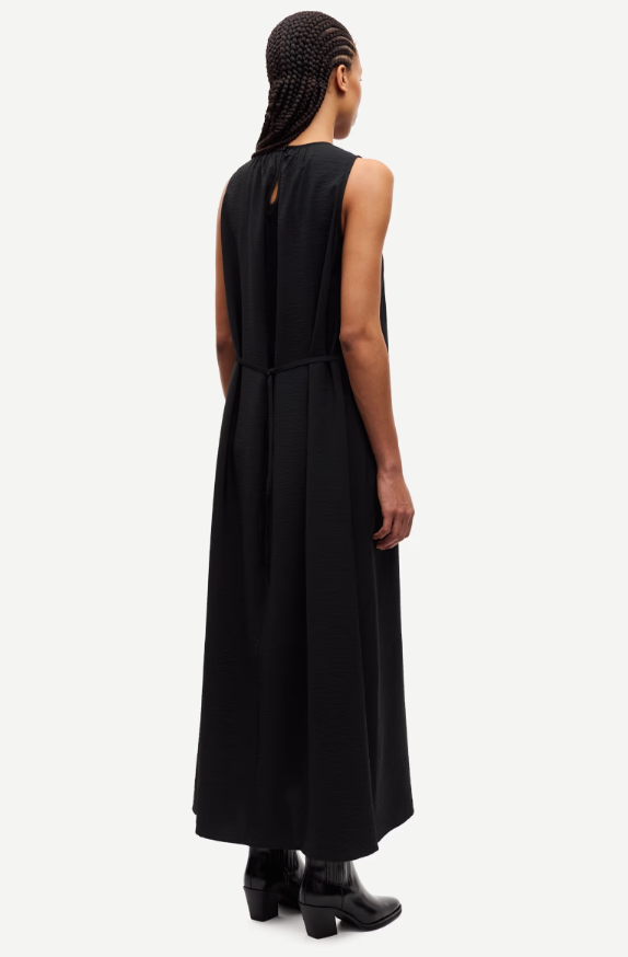 Vestido largo holgado con falda evasé. Cierre con trabilla elástica y botón en la espalda. Tirante ajustable con lazo en la espalda. Detalle drapeado en el cuello. Material principal: mezcla de viscosa LENZING™ ECOVERO™. Este producto contiene viscosa LENZING™ ECOVERO™, certificada con la etiqueta ecológica de la UE para productos textiles (licencia n.º AT/016/001) por su excelencia ambiental.