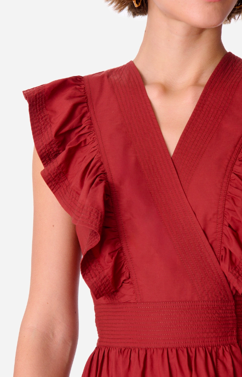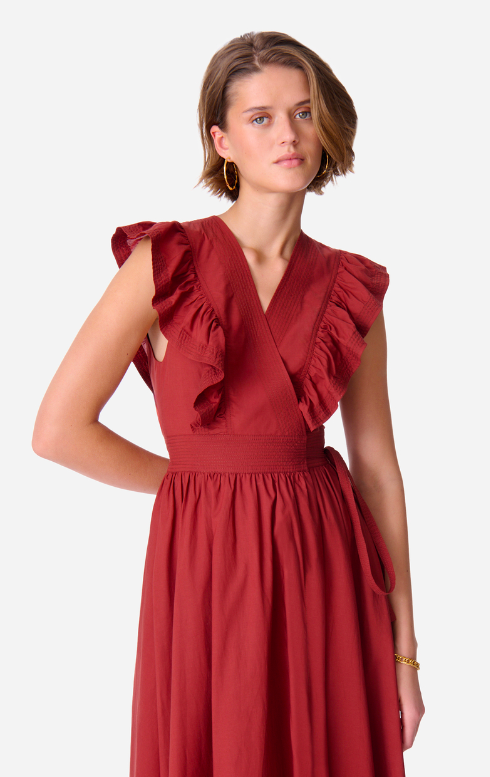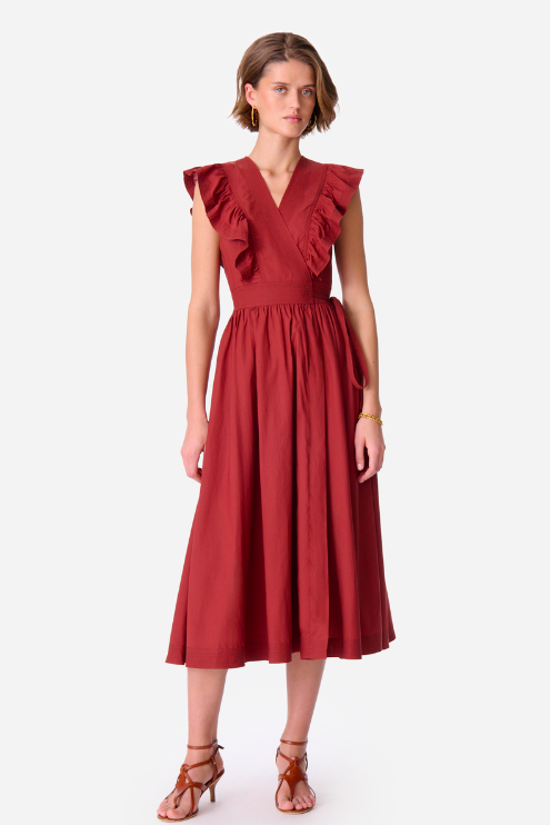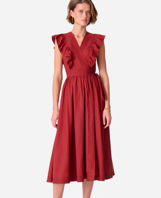 Este vestido encarna la elegancia y feminidad atemporales con su corte envolvente que favorece a todas las figuras. Su favorecedor escote en V y mangas con volantes le aportan un toque delicado y sofisticado. La cinturilla ajustable permite personalizar el ajuste para una comodidad óptima y un look elegante. Ideal para un look de día o de noche, este vestido midi combina a la perfección con sandalias planas para un look casual o con tacones para una ocasión más elegante. Versátil y refinado, es la prenda perfecta para realzar tu estilo con facilidad.