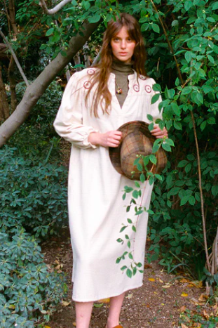 Vestido con cuello mao, mangas abullonadas y detalles bordados en pechera.