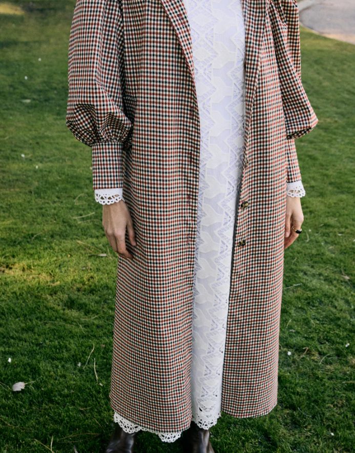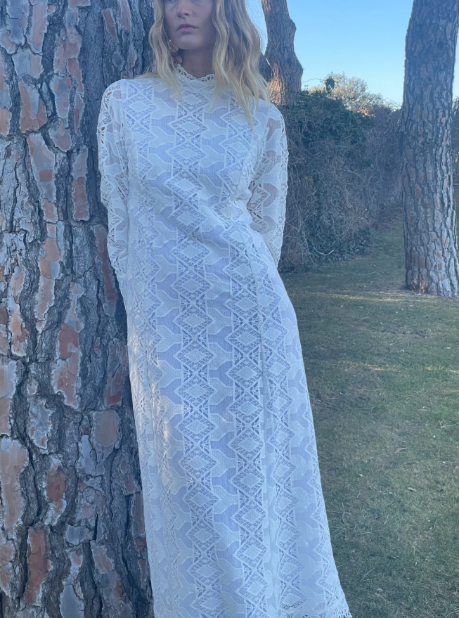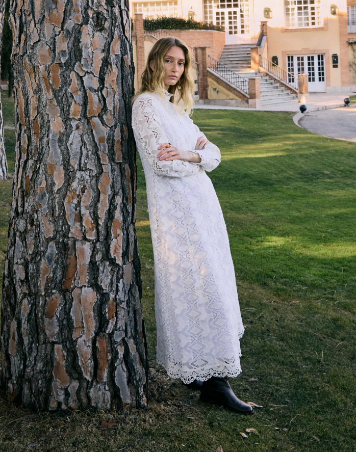 Vestido recto con corte debajo del pecho, parte de arriba queda ajustada mientras que la falda es evasé. Cuello chimenea y manga larga con puño.
